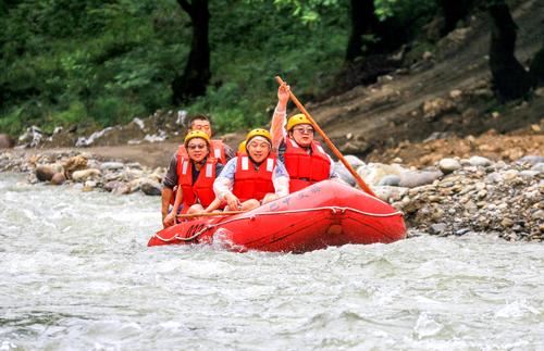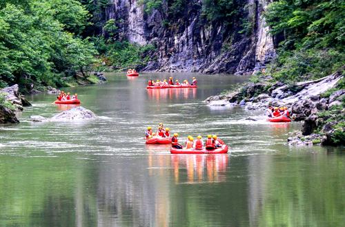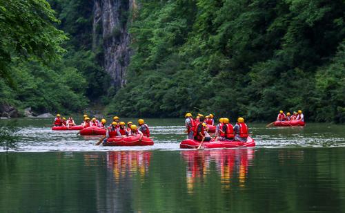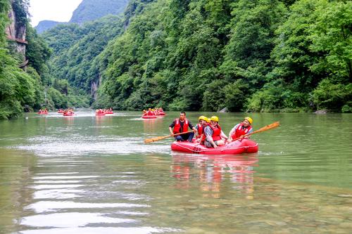 2023年5月27日,在位于四川省巴中市通江县境内的光雾山诺水河世界地质公园内,来自重庆市的游客在体验生态漂流体育项目,感受乡村原生态环境。