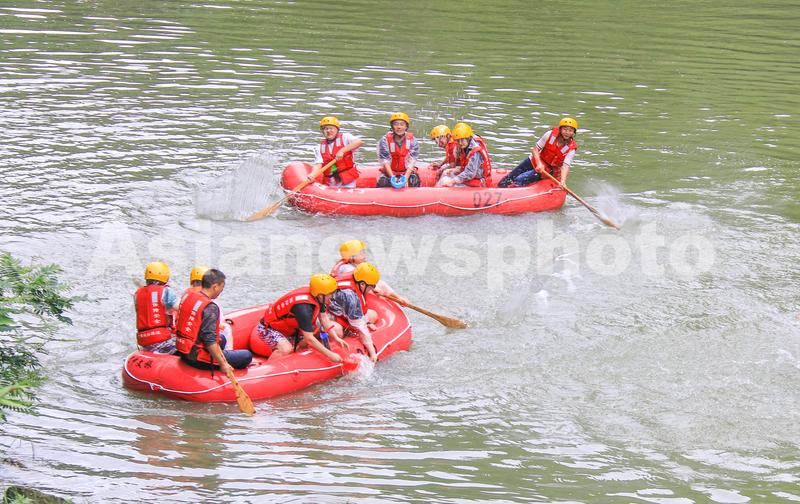 2023年5月27日,在位于四川省巴中市通江县境内的光雾山诺水河世界地质公园内,来自重庆市的游客在体验生态漂流体育项目,感受乡村原生态环境。