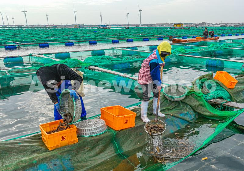 图片说明:2023年5月30日,在山东省荣成市石岛管理区桑沟湾海洋牧场生态养殖区,渔民们在收获海参。