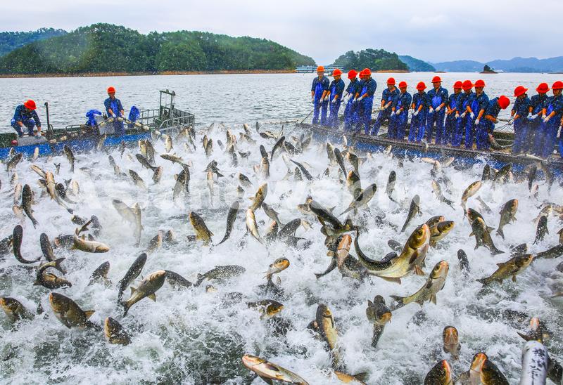 图片说明:2023年5月31日,浙江省杭州市淳安县千岛湖小金山水域再现“巨网捕鱼”盛景。