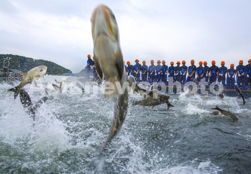 图片说明:2023年5月31日,浙江省杭州市淳安县千岛湖小金山水域再现“巨网捕鱼”盛景。