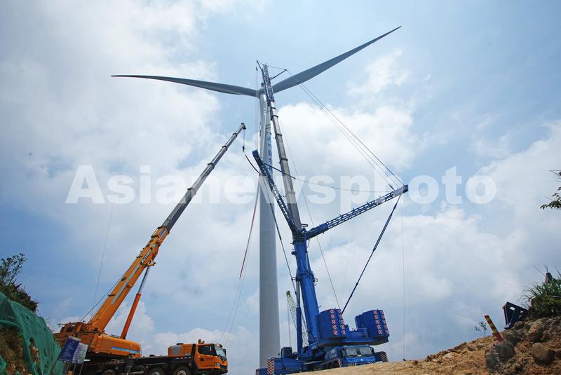 图片说明:6月1日,在位于广西融水苗族自治县的九元山风电项目施工现场,工人正在吊装叶片。