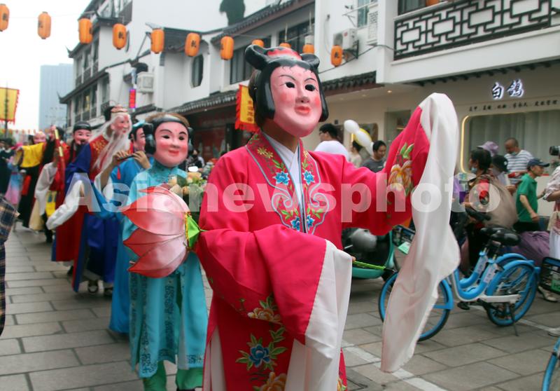 图片说明:2023年6月1日,真人装扮的“神仙”在江苏苏州石路街头巡游表演。