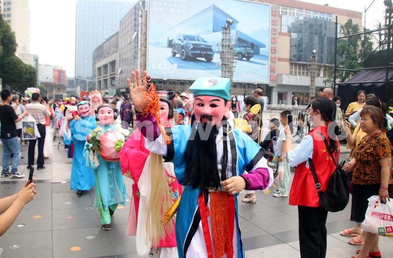 图片说明:2023年6月1日,真人装扮的“神仙”在江苏苏州石路街头巡游表演。