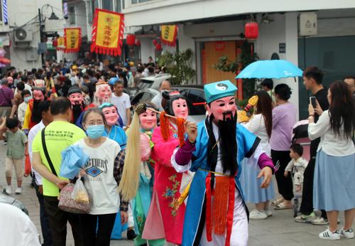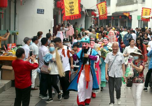 图片说明:2023年6月1日,真人装扮的“神仙”在江苏苏州石路街头巡游表演。