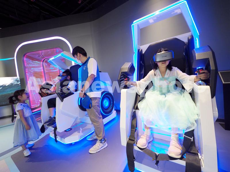 2023年6月4日,北京首钢园“2023中国科幻大会”科幻产业新技术新产品展上,小朋友在进行VR体验。