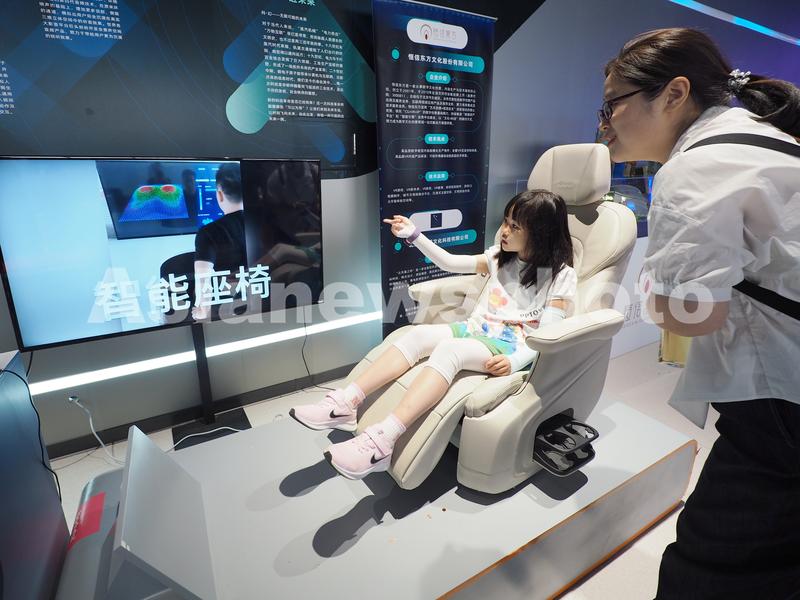 2023年6月4日,北京首钢园“2023中国科幻大会”科幻产业新技术新产品展上,小朋友在体验“智能座椅”。