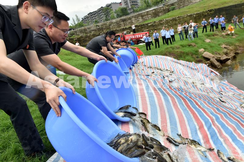 图片说明:这是参与增殖放流的法官们将胭脂鱼、岩原鲤鱼两种国家重点保护野生动物投放长江。