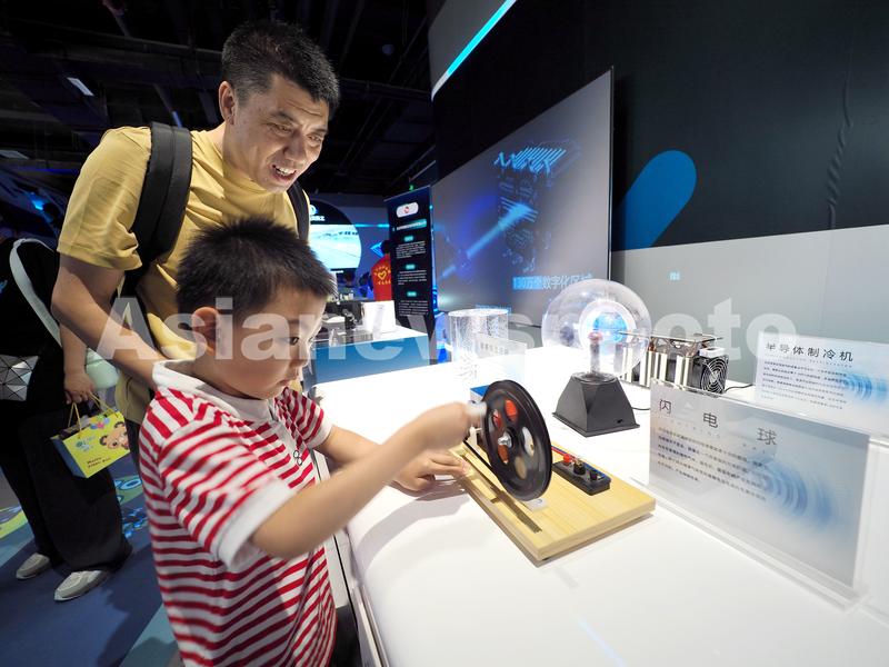 2023年6月4日,北京首钢园“2023中国科幻大会”科幻产业新技术新产品展上,小朋友在进行科学体验。