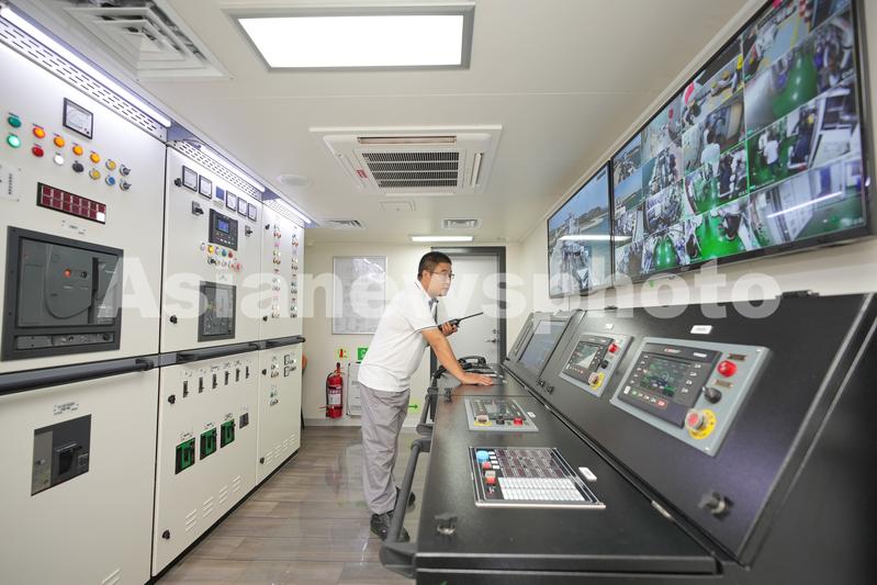 2023年6月5日,工作人员在全自动智能化活鱼运输船集控室中调试设备。