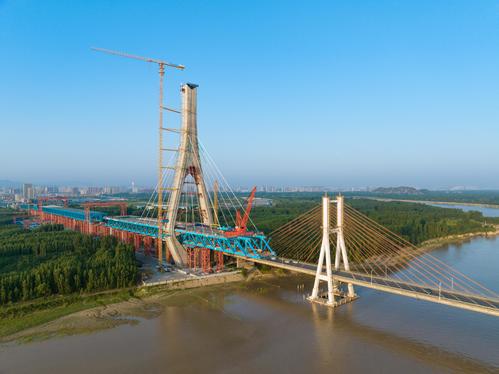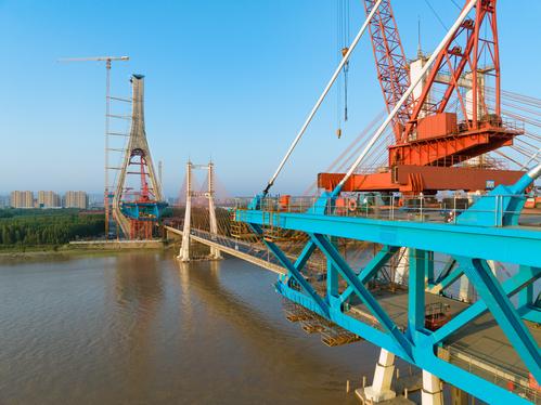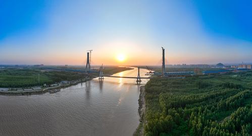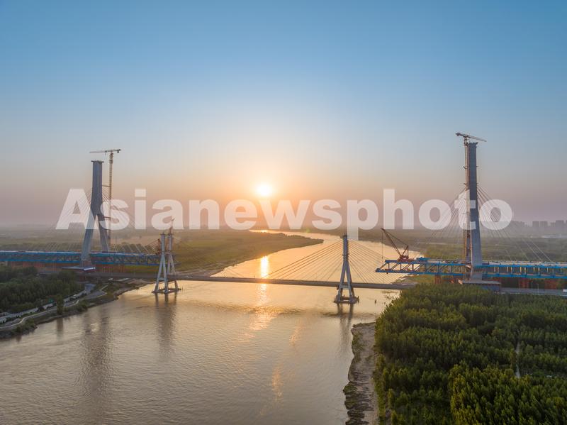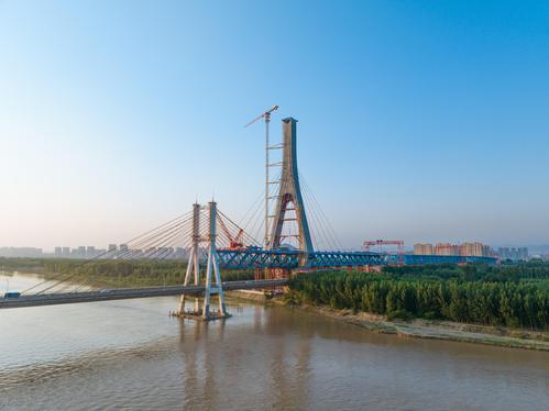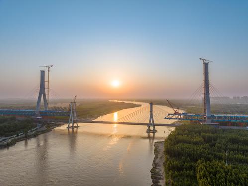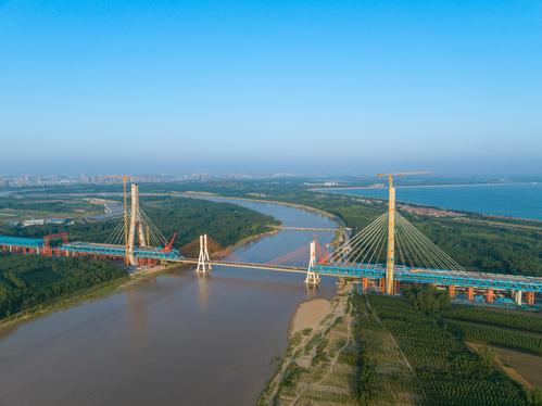 图片说明:2023年6月6日,山东济南黄河公路大桥扩建工程有序推进。