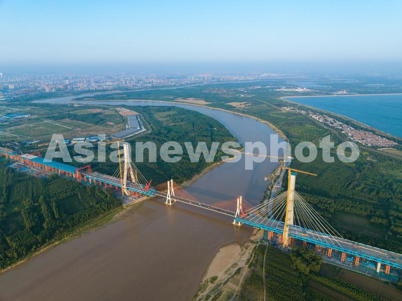 图片说明:2023年6月6日,山东济南黄河公路大桥扩建工程有序推进。
