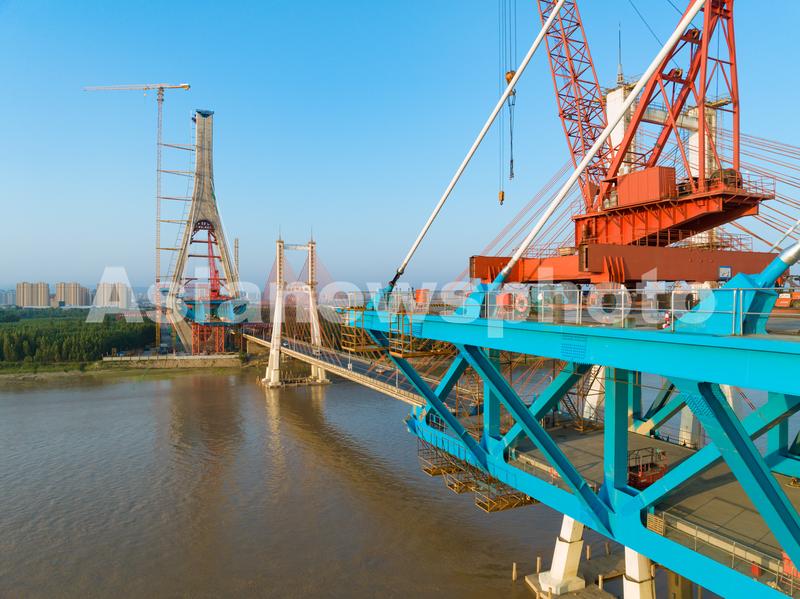 图片说明:2023年6月6日,山东济南黄河公路大桥扩建工程有序推进。