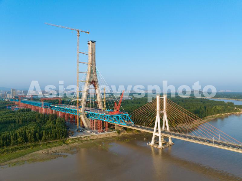 图片说明:2023年6月6日,山东济南黄河公路大桥扩建工程有序推进。