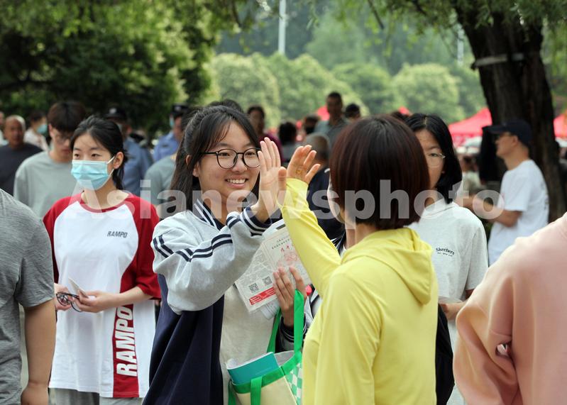 图片说明:6月7日,河南省焦作市博爱县第一中学,教师与高三考生击掌为学生们鼓励加油。