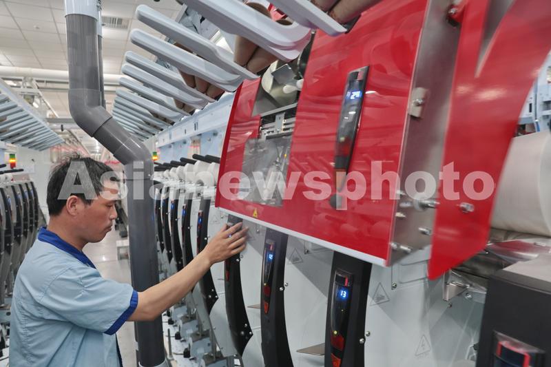 图片说明:2023年6月6日,纺织工人在位于江苏省南通市崇川区的江苏大生智慧纺纱工厂生产车间忙碌。