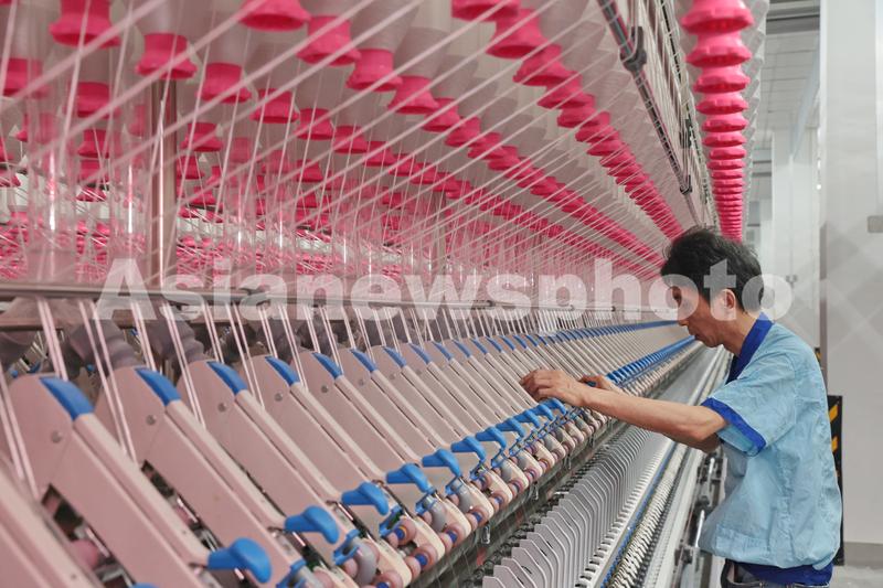 图片说明:2023年6月6日,纺织工人在位于江苏省南通市崇川区的江苏大生智慧纺纱工厂生产车间忙碌。