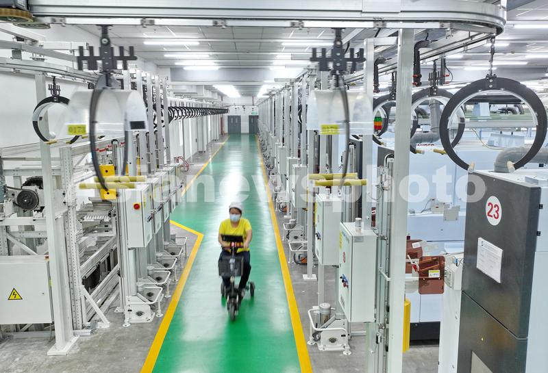 图片说明:2023年6月6日在江苏省南通市崇川区拍摄的江苏大生智慧纺纱工厂忙碌的生产车间。