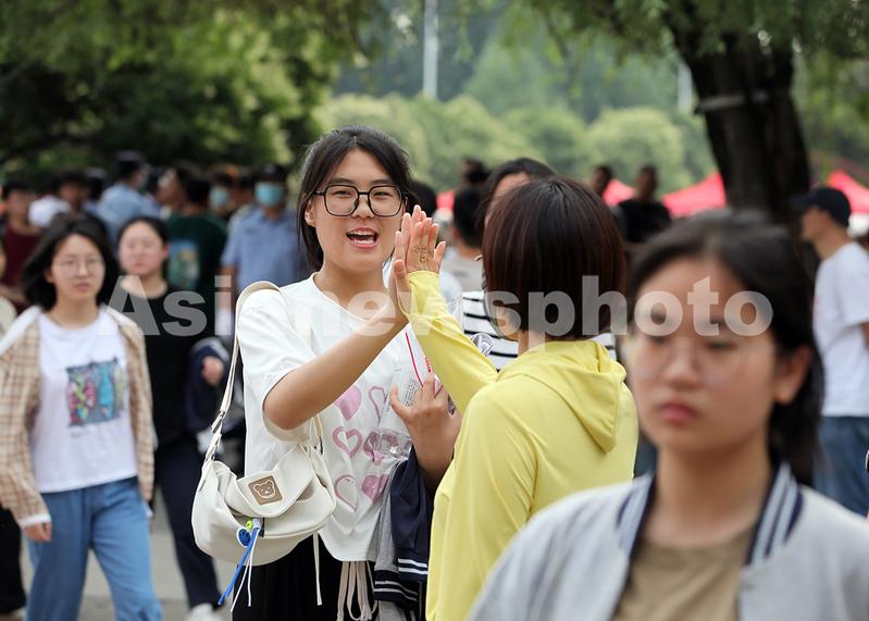 图片说明:6月7日,河南省焦作市博爱县第一中学,教师与高三考生击掌为学生们鼓励加油。