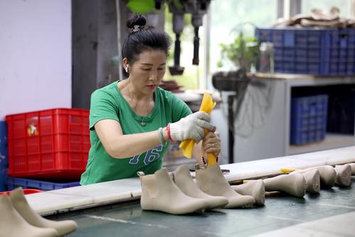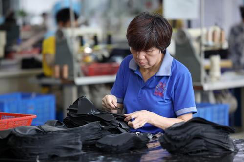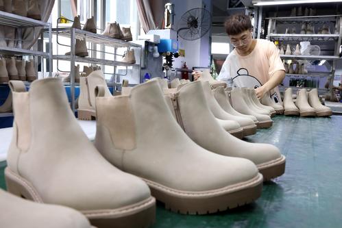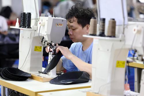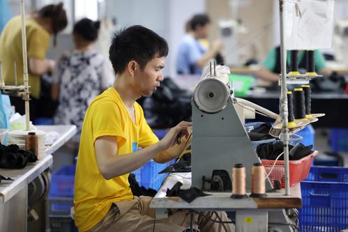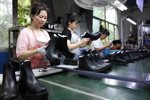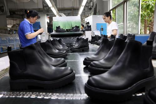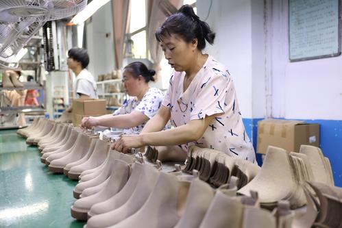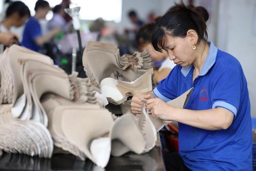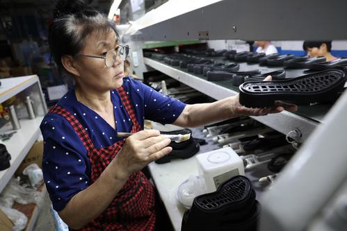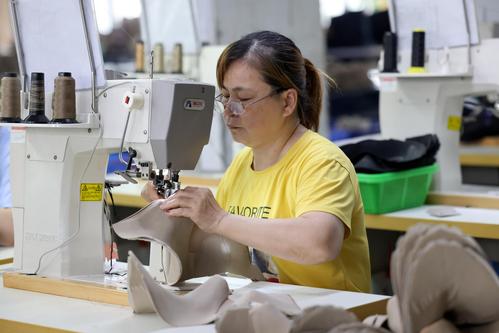 2023年6月7日,在福建省福州市仓山区一家鞋企生产线上,工人们正抓紧生产出口订单。