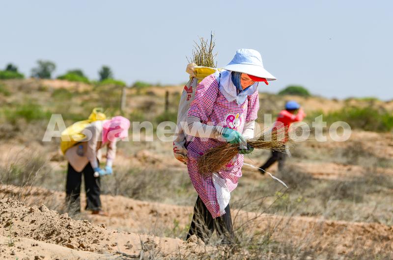 图片说明:2023年6月7日,鄂托克前旗治沙人员在毛乌素沙漠栽种柠条。