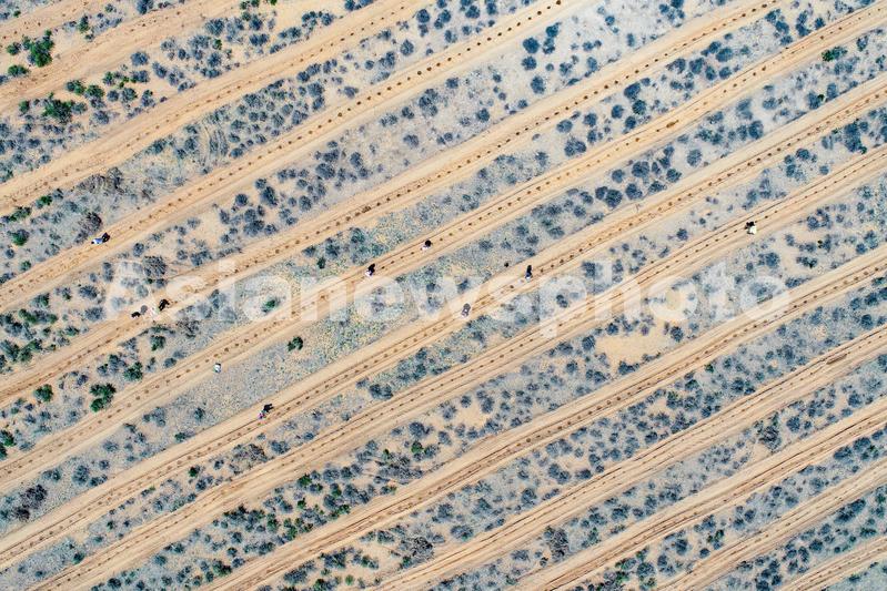 图片说明:2023年6月7日,鄂托克前旗治沙人员在毛乌素沙漠栽种柠条(无人机照片)。