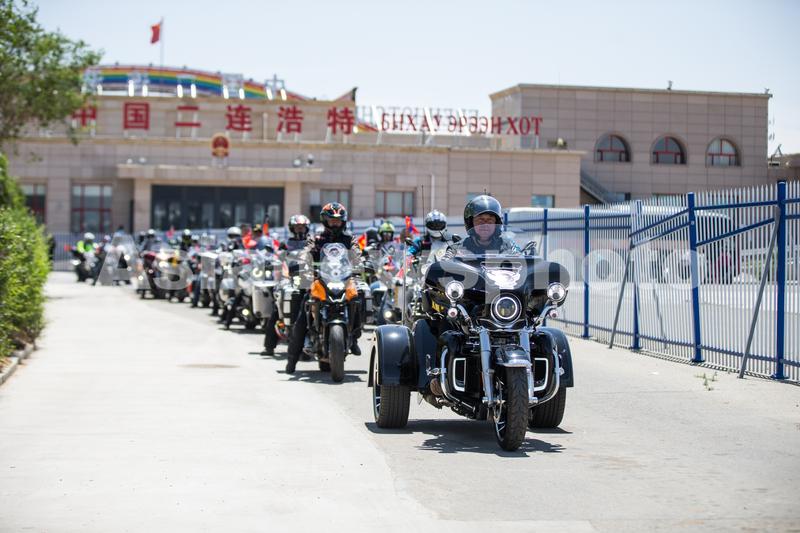 2023年6月7日,摩托车自驾旅游团从二连浩特公路口岸出境。