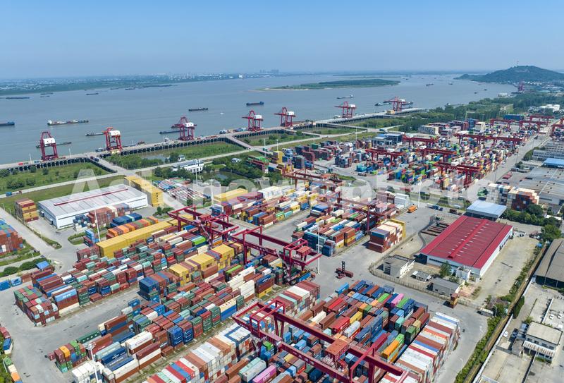 2023年6月8日,安徽省芜湖港朱家桥国际集装箱码头上的大型龙门吊正在装卸作业(无人机照片)。