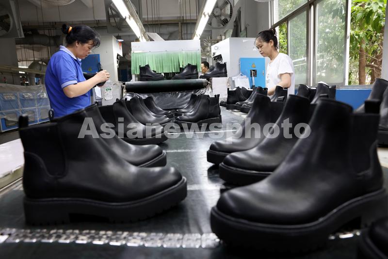 2023年6月7日,在福建省福州市仓山区一家鞋企生产线上,工人在检验出口皮鞋。