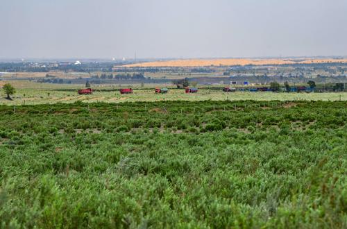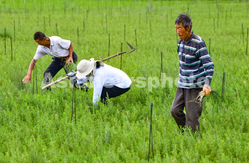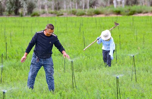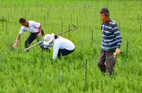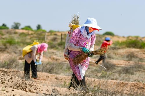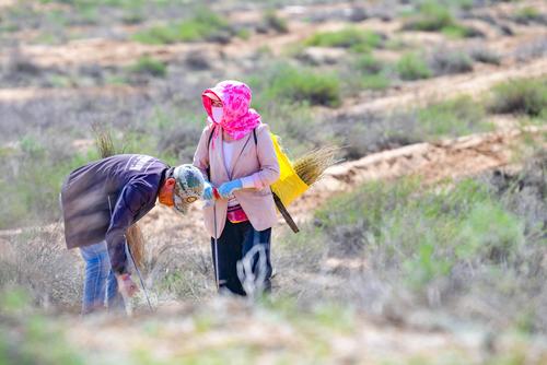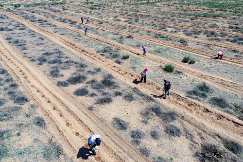 2023年6月7日,鄂托克前旗治沙人员在柠条苗地里作业。