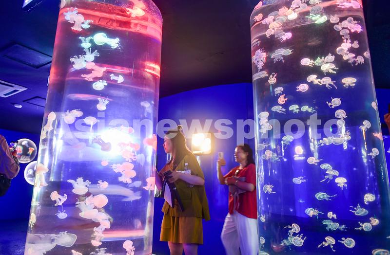 图片说明:2023年6月8日,游客在山东青岛海底世界景区参观各类水母。