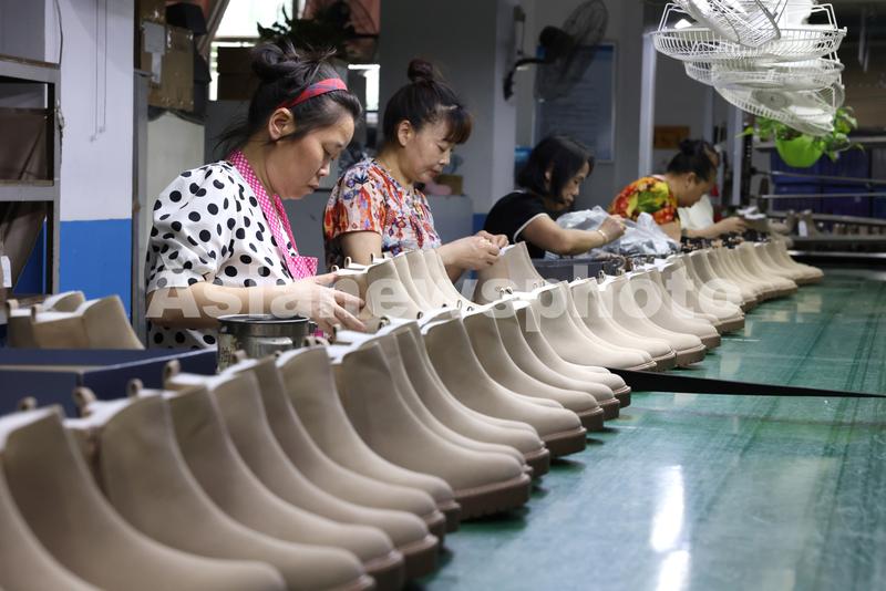 2023年6月7日,在福建省福州市仓山区一家鞋企生产线上,工人们正抓紧生产出口订单。