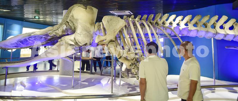 图片说明:2023年6月8日,游客在山东青岛海底世界景区参观抹香鲸骨骼标本。