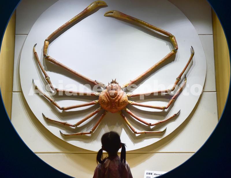 图片说明:2023年6月8日,小朋友在山东青岛海底世界景区参观巨螯蟹标本。