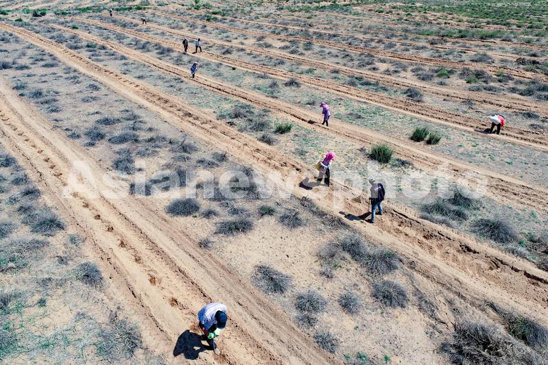 图片说明:2023年6月7日,鄂托克前旗治沙人员在毛乌素沙漠栽种柠条(无人机照片)。