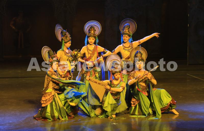 2023年6月8日晚,演员在大型洞窟式沉浸体验剧《乐动敦煌》中表演。该剧溯源敦煌文化,借助对莫高窟壁画、藏经洞古籍的深度解读梳理,活化敦煌古乐器、古乐谱研发成果,采用全息投影、3D威亚等高科技手段,以全沉浸式的呈现方式,演绎了西域少年白氏追寻艺术的动人故事。