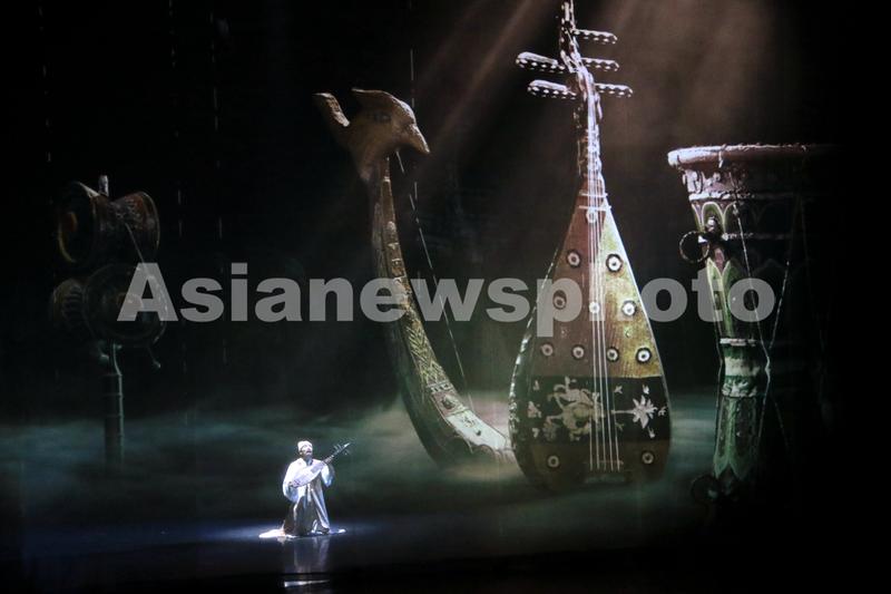 2023年6月8日晚,演员在大型洞窟式沉浸体验剧《乐动敦煌》中表演。该剧溯源敦煌文化,借助对莫高窟壁画、藏经洞古籍的深度解读梳理,活化敦煌古乐器、古乐谱研发成果,采用全息投影、3D威亚等高科技手段,以全沉浸式的呈现方式,演绎了西域少年白氏追寻艺术的动人故事。