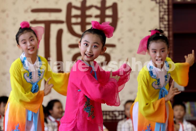 2023年6月9日,在山东省枣庄市东湖小学,爱好戏剧的学生向同学们表演柳琴戏《喝面叶》选段。