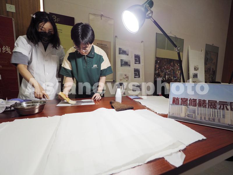 图片说明:2023年6月9日,北京市档案馆,观众在体验档案修裱技艺。