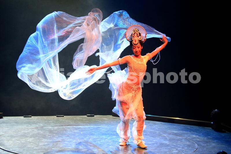 2023年6月8日晚,演员在大型洞窟式沉浸体验剧《乐动敦煌》中表演。该剧溯源敦煌文化,借助对莫高窟壁画、藏经洞古籍的深度解读梳理,活化敦煌古乐器、古乐谱研发成果,采用全息投影、3D威亚等高科技手段,以全沉浸式的呈现方式,演绎了西域少年白氏追寻艺术的动人故事。