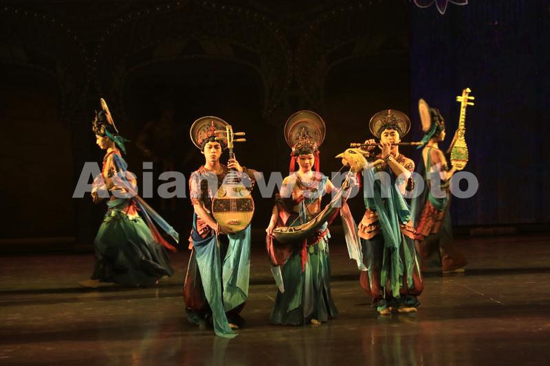 2023年6月8日晚,演员在大型洞窟式沉浸体验剧《乐动敦煌》中表演。该剧溯源敦煌文化,借助对莫高窟壁画、藏经洞古籍的深度解读梳理,活化敦煌古乐器、古乐谱研发成果,采用全息投影、3D威亚等高科技手段,以全沉浸式的呈现方式,演绎了西域少年白氏追寻艺术的动人故事。