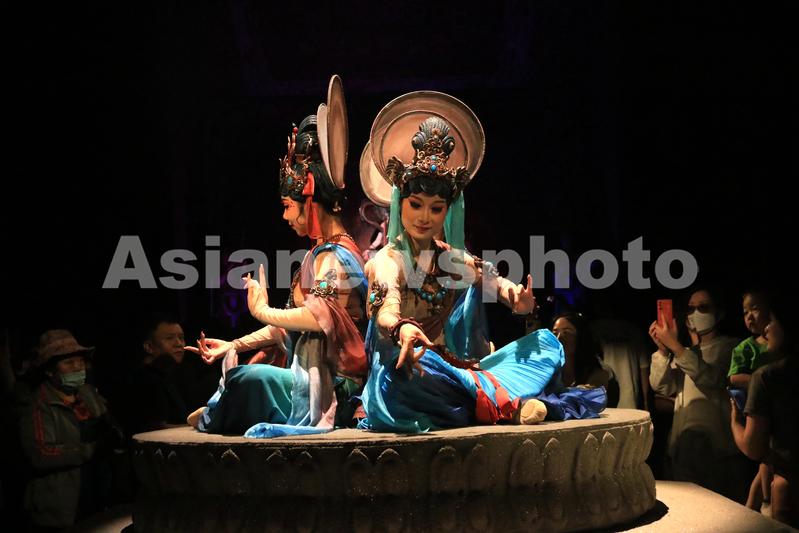 2023年6月8日晚,演员在大型洞窟式沉浸体验剧《乐动敦煌》中表演。该剧溯源敦煌文化,借助对莫高窟壁画、藏经洞古籍的深度解读梳理,活化敦煌古乐器、古乐谱研发成果,采用全息投影、3D威亚等高科技手段,以全沉浸式的呈现方式,演绎了西域少年白氏追寻艺术的动人故事。
