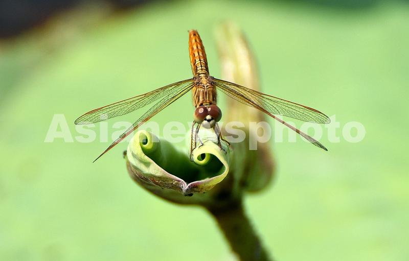 图片说明:6月12日,在河北省邯郸市龙湖公园荷塘里,蜻蜓飞落在荷叶上。