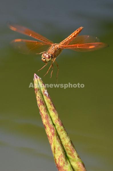 图片说明:6月12日,在河北省邯郸市龙湖公园荷塘里,蜻蜓飞落在荷叶上。