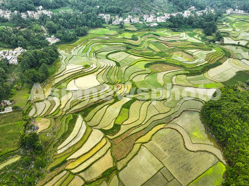 图片说明:2023年6月12日,贵州省黔西市雨朵镇雨朵社区,梯田层层叠叠色彩斑斓,阡陌纵横,田垄交错,勾画出一幅初夏稻秧开叶生机盎然的田园风光。