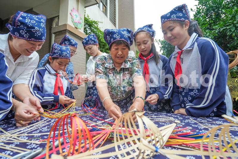 6月10日,浙江省湖州市长兴县太湖图影图影村文化礼堂,当地的妇女和孩子们在竹编艺人的指导下学习竹篾编制技艺。