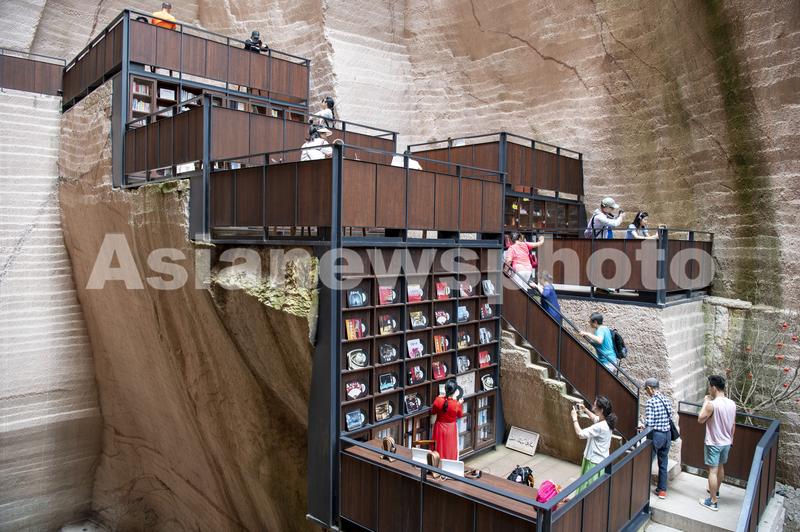 2023年6月11日,位于浙江省丽水市缙云县仙都景区的“浙江图书馆·岩宕书房”里,游客坐在洞中书房聆听或阅读,感受别样的书香文韵。