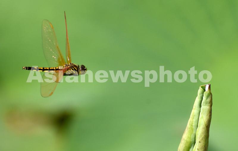 图片说明:6月12日,在河北省邯郸市龙湖公园荷塘里,蜻蜓飞落在荷叶上。