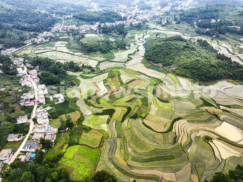 图片说明:2023年6月12日,贵州省黔西市雨朵镇雨朵社区,梯田层层叠叠色彩斑斓,阡陌纵横,田垄交错,勾画出一幅初夏稻秧开叶生机盎然的田园风光。