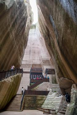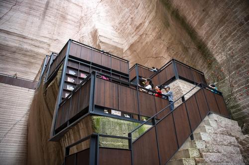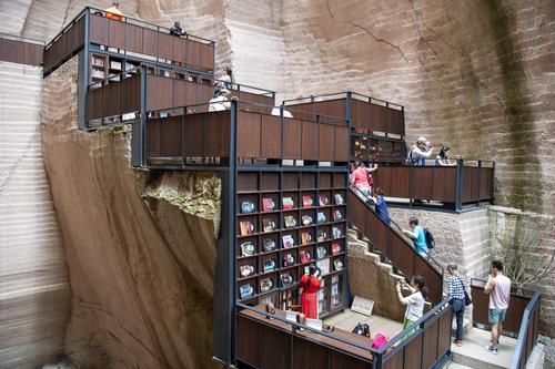 岩宕书房位于缙云县仙都景区8号岩宕,净高38米、深度约50米,是顶部完全开放的露天空间。走进书房,一条长约20余米的“之”字形石径首先映入眼帘,随之看到的是周边一排排石台,还有上面那摆放着由竹楠木制成的书架与栏杆。书房内不仅上架有精心挑选的缙云地方文献和适合大众的休闲阅览书刊,同时配备了图书自助借还机,游客可现场开通借阅功能将书借回家。借走的图书可归还至省内任意县及以上公共图书馆。